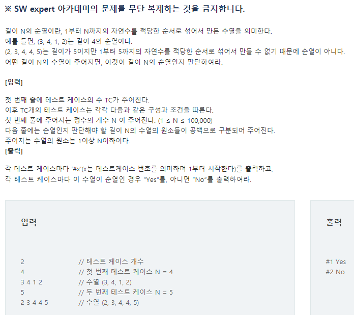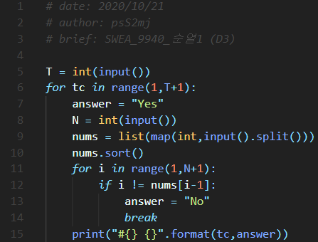 N이 입력되었을 때, 순열이 맞다면 1부터 N까지의 숫자가 한 번씩 다 있어야 한다는 점에 착안해서 테스트 케이스로 입력 받은 숫자들을 sorting 해주고 1부터 N까지의 숫자가 차례대로 있다면 "YES" 아니라면 "NO"를 출력하도록 했다.