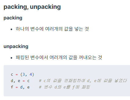 파이썬에서는 packing(패킹)과 unpacking(언패킹)이라는 개념이 존재한다.