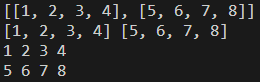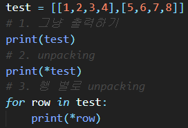 출력 결과를 살펴보면 궁극적으로 2차원 배열의 각 요소들의 순수한 int 값들만이 출력된 것을 확인할 수 있다. 이런 식으로 unpacking을 해주면 리스트가 아니라 리스트 안의 각각의 요소들을 하나씩 출력해준다.