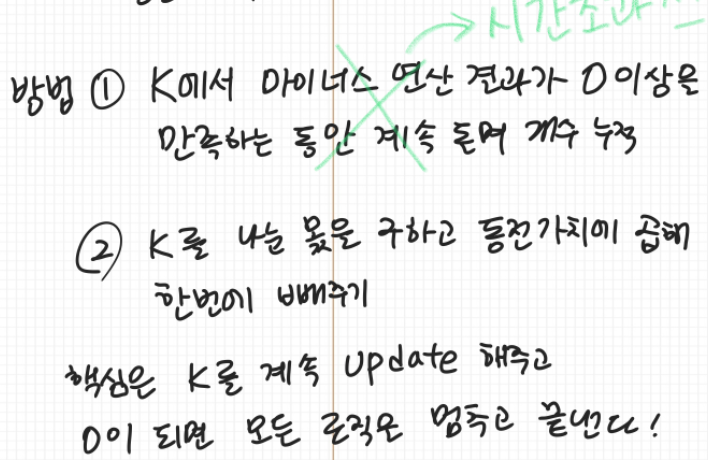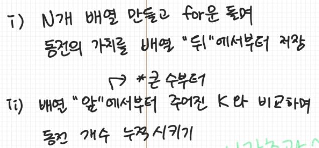 1. K(가치의 합)과 현재 동전 가치를 비교하면서 K에서 동전의 가치만큼 빼주는 과정을 반복한다. (0 이상인 동안) 이 과정을 한 번 수행할 때마다 동전의 개수도 1씩 증가시킨다.
