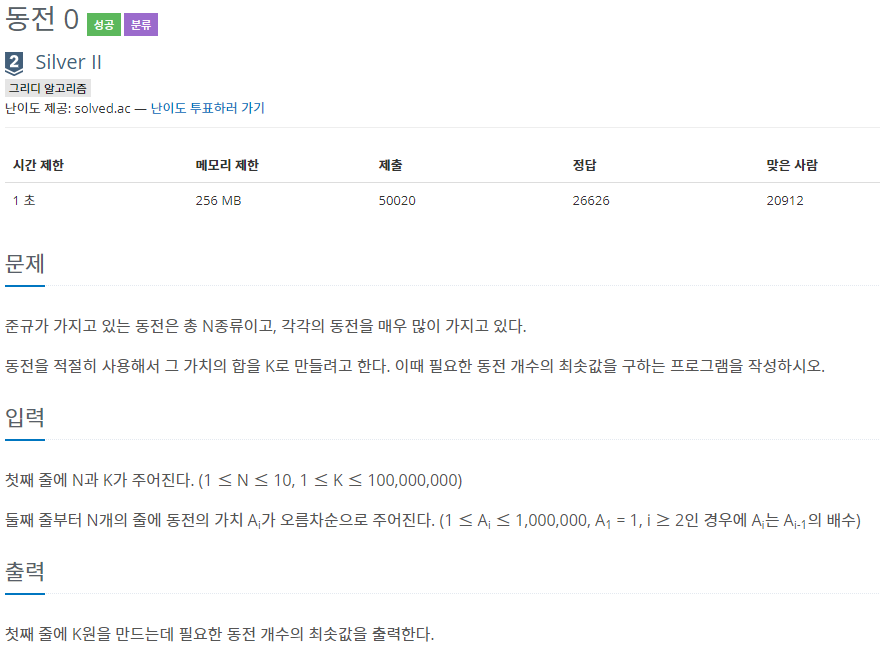 www.acmicpc.net/problem/11047 (level: Silver II)
