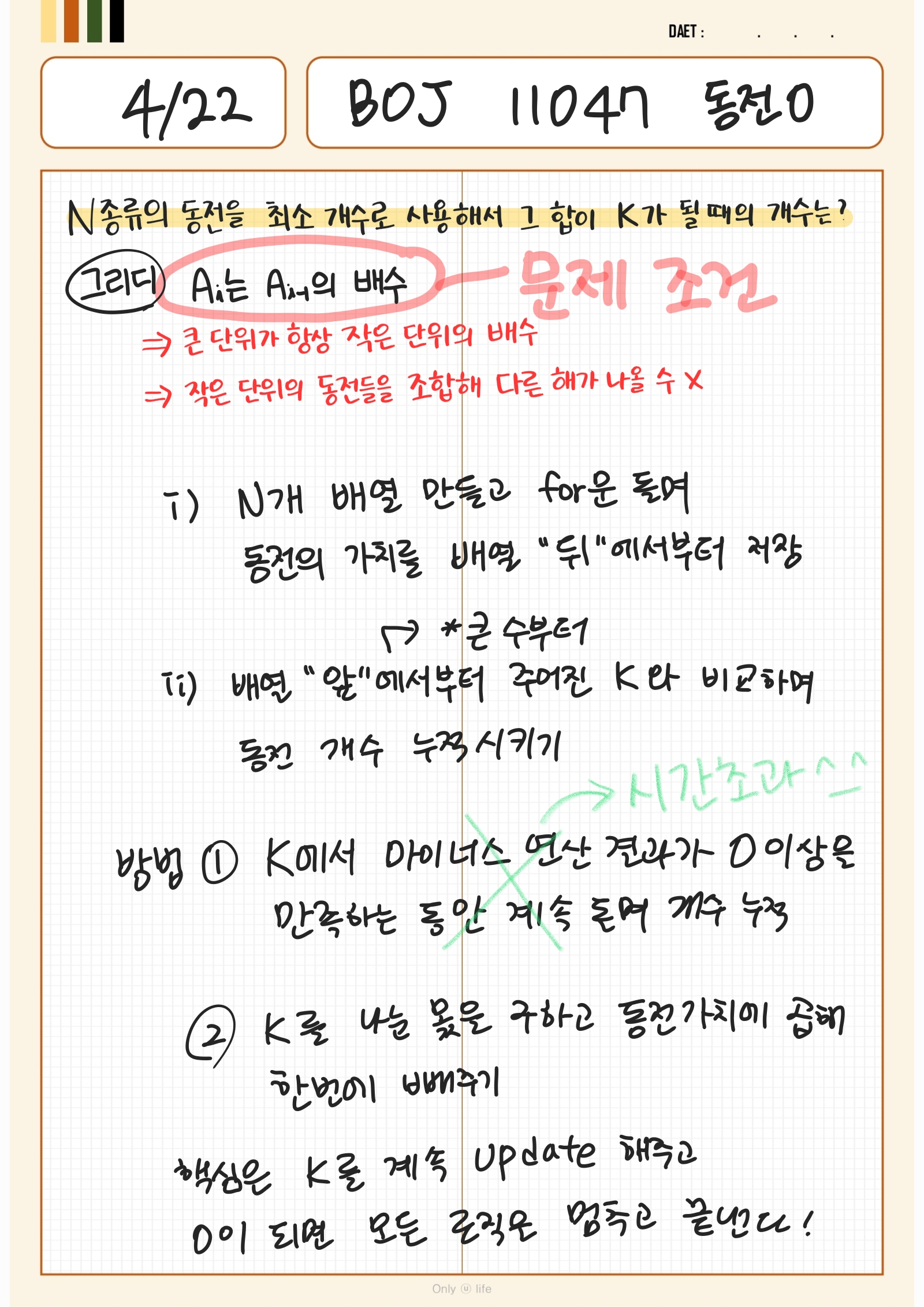 그리고 이 백준 11047번 문제 역시 문제에 나와 있는 Ai는 Ai-1의 배수 (티스토리에서 아래첨자 어떻게 쓰는지 모르겠어서 그냥 씁니다,,^_^) 라는 조건에 의해 그리디라는 조건이 충족되는 것으로 판단된다.