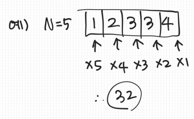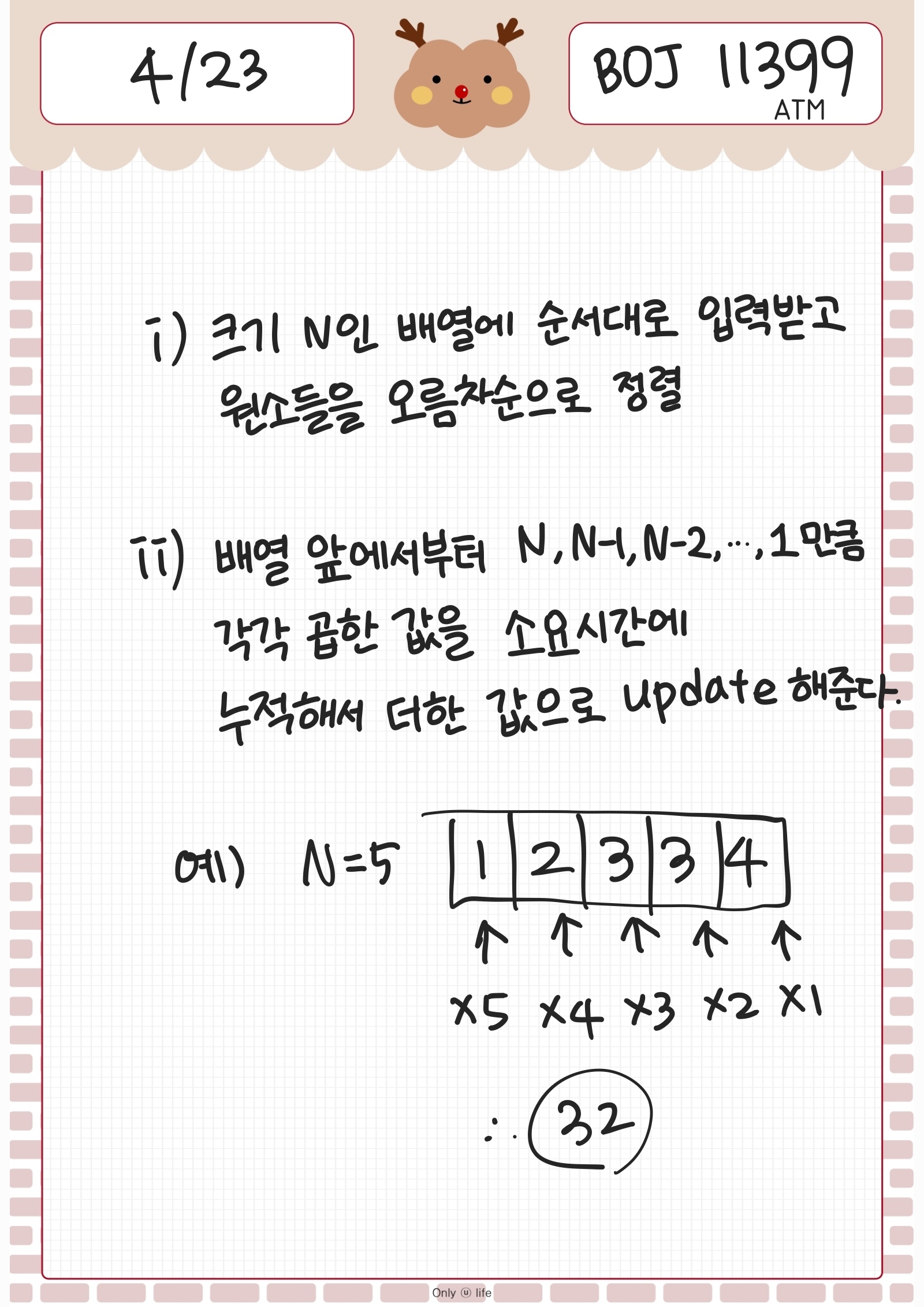 즉, 이 문제의 예시에서는 입력이 [3 1 4 3 2]로 주어지니까 배열에 저장한 뒤에 오름차순으로 정렬해 [1 2 3 3 4]로 만들어주고 👉🏻여기까지가 핵심 1번 /// 맨 앞에서부터 N번, N-1번, N-2번, N-3번, 마지막은 1번만 포함되는 것으로 계산해준 뒤 모두 더하면 된다. (물론, 더하는 연산은 이 로직을 반복 수행할 때마다 바로바로 update 해주는 것으로~🙄) 👉🏻여기까지가 핵심 2번