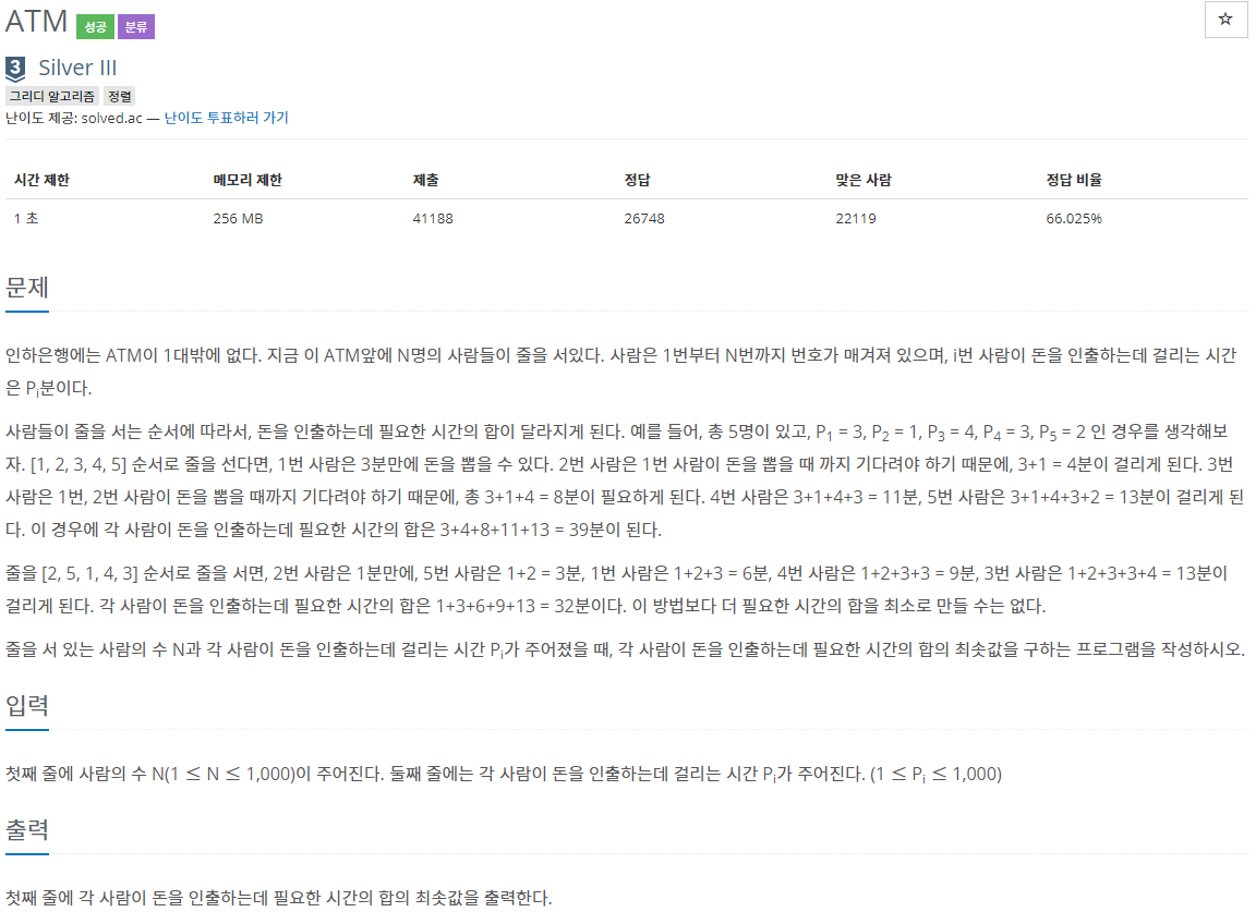 아무튼 요지는 사람이 N명 있고, 각각 인출하는 데 걸리는 시간이 주어지는데 (이것도 당연히 N개) 이때 시간이 가장 적게 걸리는 경우, 그 시간이 얼마나 되는지 구해봐라- 뭐 이런 문제였다.