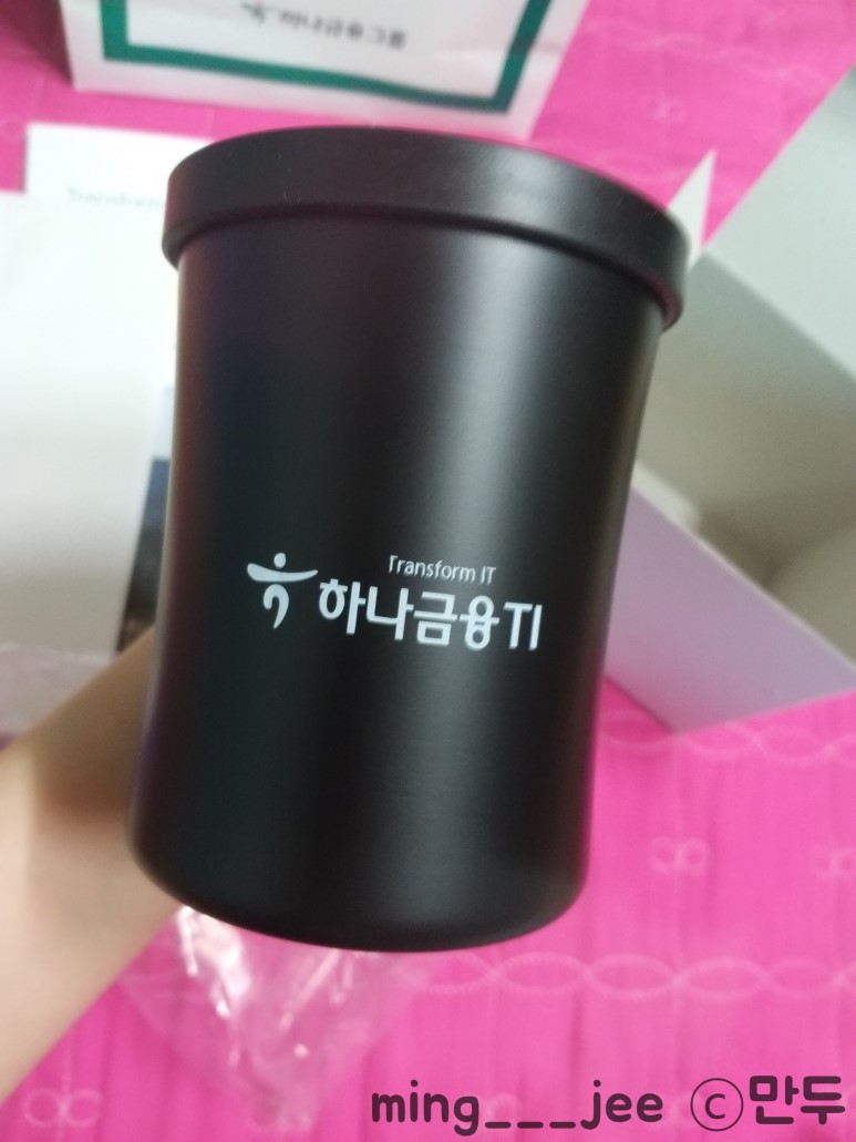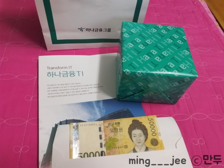 면접비 5만원 그리고 하나금융티아이 안내책자 쯤으로 보이는 팜플렛과 고무마개같은 뚜껑이 있는 머그컵(?)