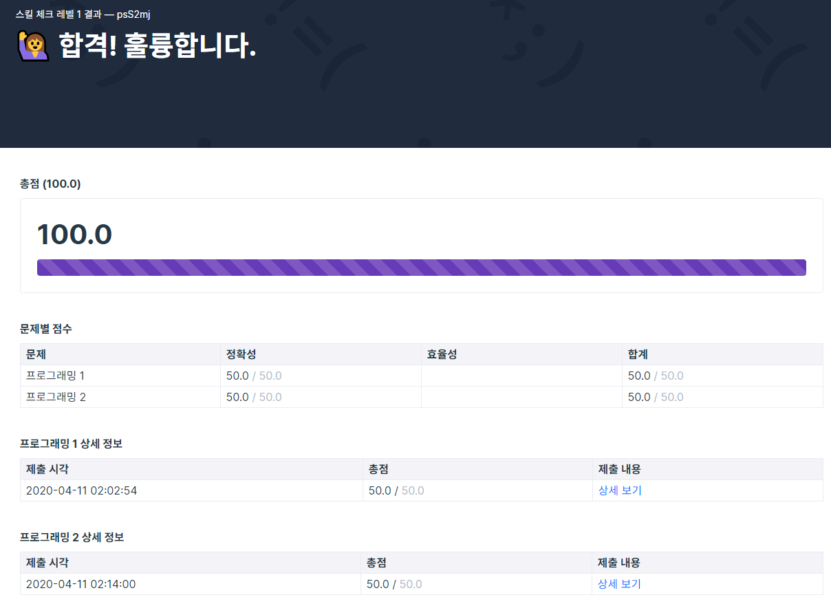그리고 두 문제를 가볍게 맞히며 테스트 통과!! 야호~~~^_^