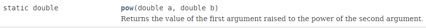 JAVA API 문서에서 캡처해온 것인데 이 pow 메소드를 활용하면 아주 손쉽게 거듭 제곱한 결과를 얻을 수 있다.