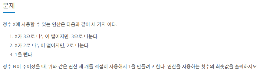 이 문제는 주어진 입력값 N을 3가지 연산을 통해 이러쿵 저러쿵해서 결론적으로는 1을 만드는 것이 목표다. 단, 이때 연산의 횟수가 최소가 되도록 해야하는 것이 핵심이며 그때의 연산횟수를 출력하는 것이 문제다.