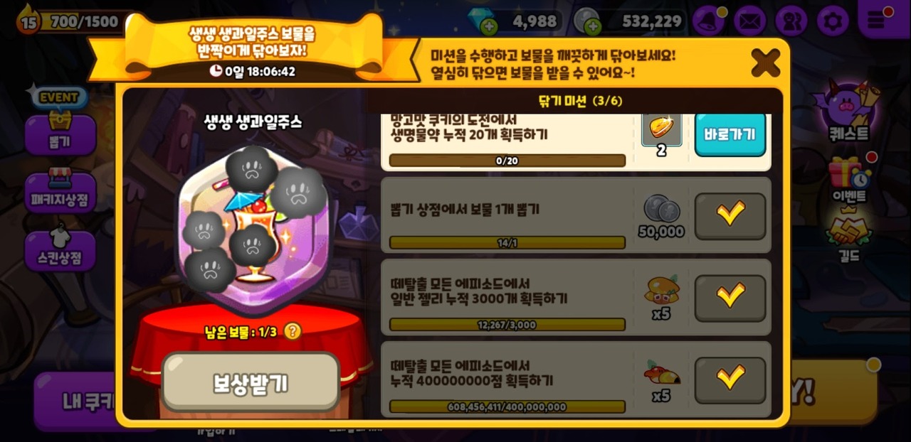 망고맛쿠키와 펫, 그리고 생생 생과일주스라는 보물을 얻었다.