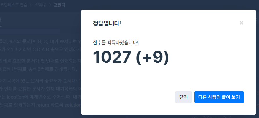4. 한편, 만약 나보다 중요도가 큰 녀석이 하나도 없다면 (cnt==0일 때) 내 자신을 출력하면 된다. 문제에서 요구하는 것은 '몇 번째로 출력되는가?'이므로 answer를 1 증가시킨다. 그리고나서 처음에 파라미터 값으로 주어졌던 location과 현재 내가 출력하려고 하는 원소의 인덱스 값이 같다면 while문을 벗어난다. (이게 몇 번이나 반복될지 모르니까 while문을 사용했다.)