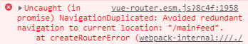 진행 중인 프로젝트에서 네비게이션바를 이용하고 있는데 현재 페이지에서 또 같은 경로를 클릭하면 이런 에러가 발생한다. (겉으로 보기에는 문제가 없지만 콘솔 열어보면 이런 내용의 에러가 떠있음)